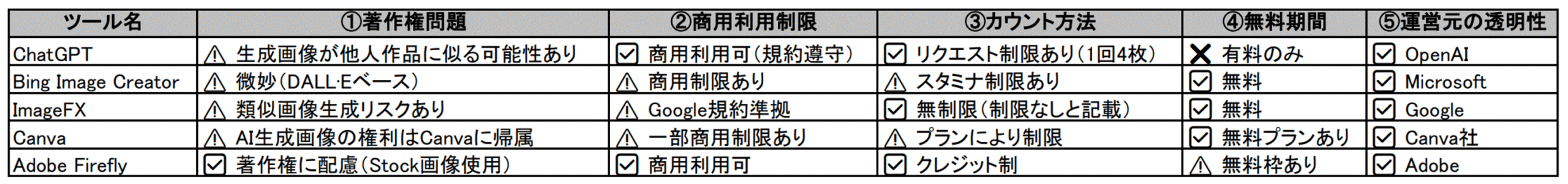 生成画像は商用利用が制限される場合がありますので、利用規約の確認が必要です。