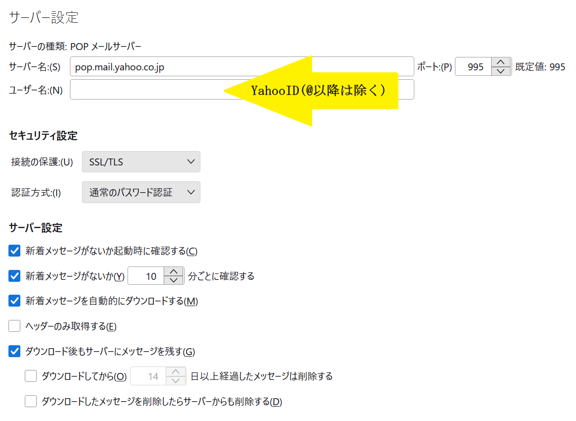 • 送受信が正常に動作しない場合は、まずユーザー名の設定(YAHOO! IDの形式)を再確認してから、他の設定項目を見直してください